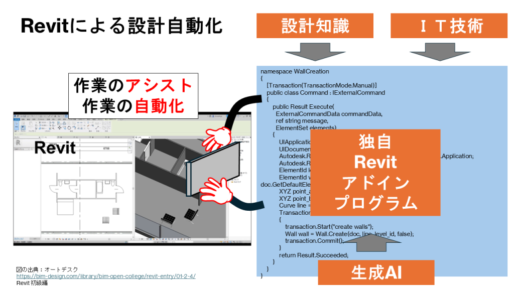 - 独自のRevitアドインプログラムを搭載すれば作業のアシスト、自動化ができる