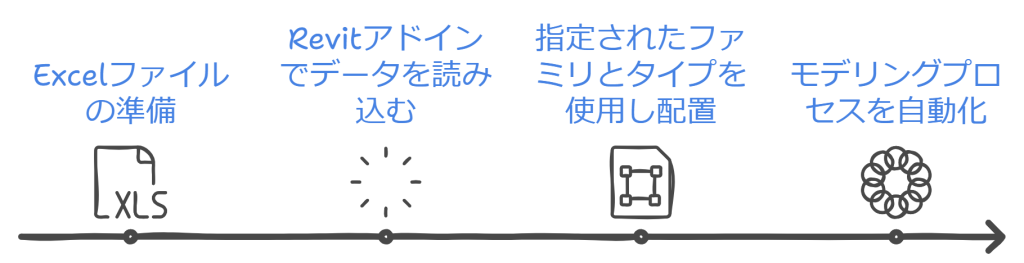 このプロセスで人が「Revitに入力する」作業は、創造や思考といった人間ならではの部分は少なく、ほとんどが機械的な作業です。しかし、この作業には多くの時間がかかります。そこで、Revitアドインを使ってこの部分を自動化することで、効率を大幅に向上させることができると思います。