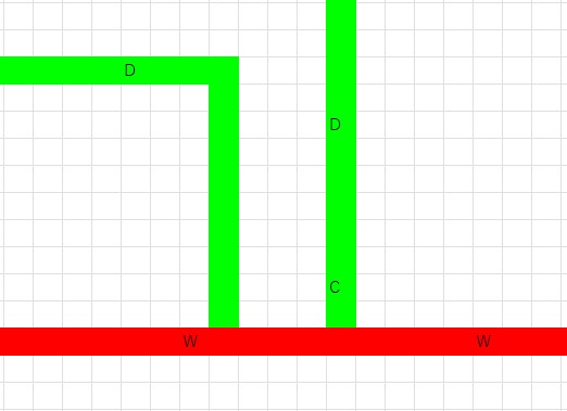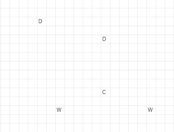 }次に3番目のシートにある色塗りで作ったプラン案を読みます。下の図は前に説明したものですが、赤が外壁、緑が内壁、柱はC、窓はW、ドアはDでマークしてあります。