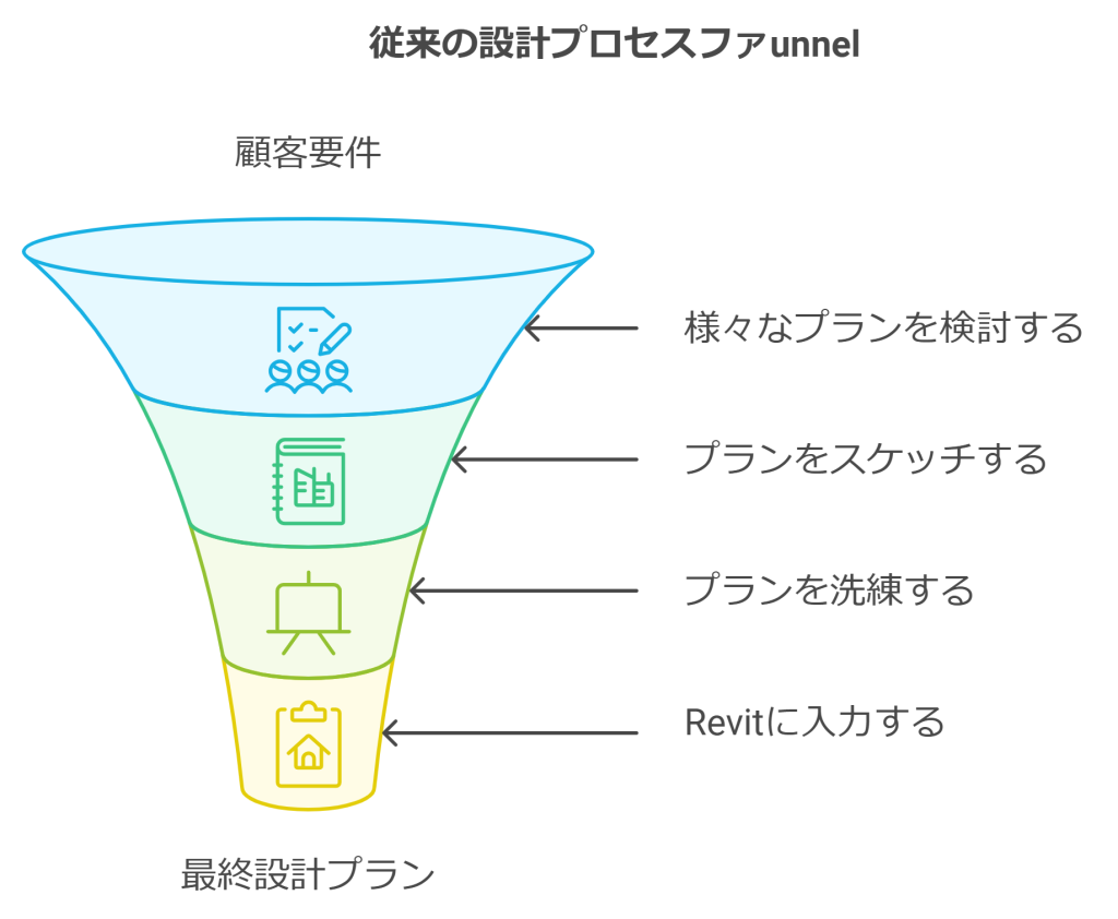 従来の設計では、設計者が顧客の条件に合うプランをいくつも検討し、最終的にマウスを使ってRevitに入力します。ただし、現在はRevit以外のCADソフトを使うことが多いと思います。
