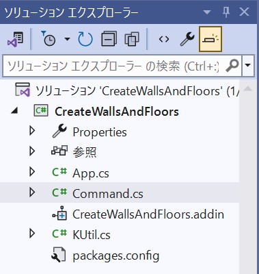 開発システムVisualStudioを使用しますが、そのファイルの構成は次の通りです。ここでプロジェクト名はCreateWakksAndFloorsとします。中心となるファイルはCommand.csとKUtil.csです。前者はメインのファイル、後者はよく使うメソッドを私がまとめたユーティリティファイルです。CreateWakksAndFloors.addinは設定ファイルです。なおアドインはRevitのバージョンによって参照すべきファイルが異なりますので注意が必要です。