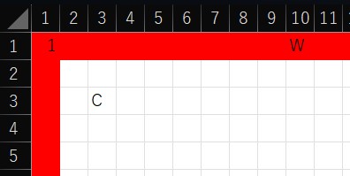 外壁の接続点の数字、柱を表すC、窓を表すW、ドアを表すDの情報を記憶するvalueArray配列を作ります。これもC#の中の配列valueArray = new string[cellsRange.End.Row, cellsRange.End.Column];のことです。
