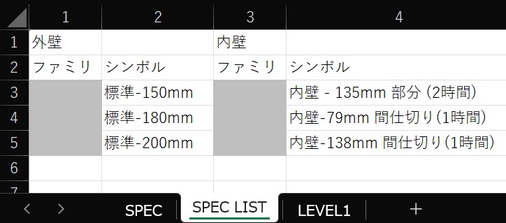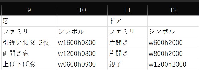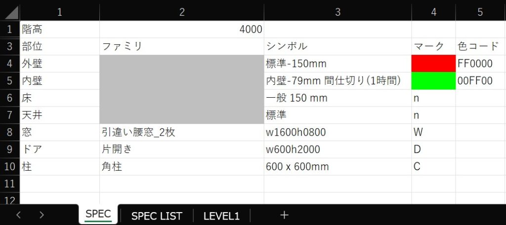 Excel案に戻ります。外壁は赤、内壁は緑でセルを塗りつぶすことによって壁を指定します。この例では外壁、内壁、窓、ドアはそれぞれ1種類しか指定できませんが壁の種類をW1, W2, W3など複数に拡張することも可能でしょう。使用するRevitファミリ、タイプは使用しているテンプレート等によって異なりますので注意してください。