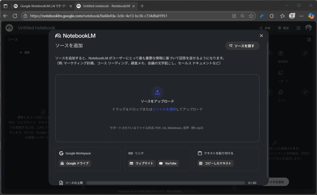 GoogleのAIであるGeminiは名が知れていますが、Google NotebookLMは有名ではありません。これはGoogleの画面を開いたときにブラウザの右上に出る実験フラスコのアイコンから行けます。Search Labsというサービス群です。無料。