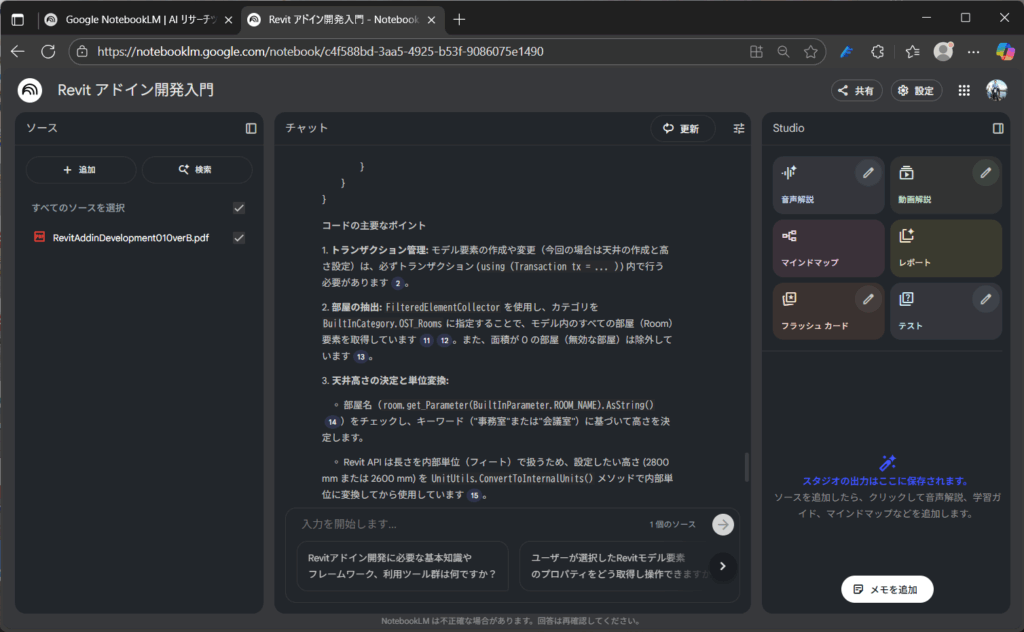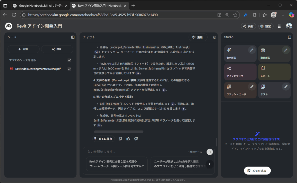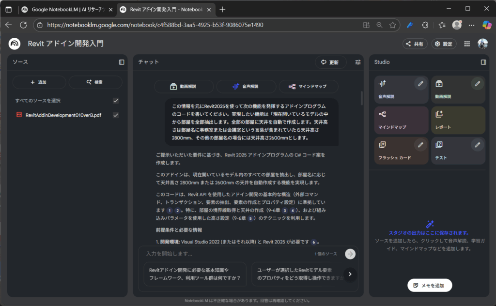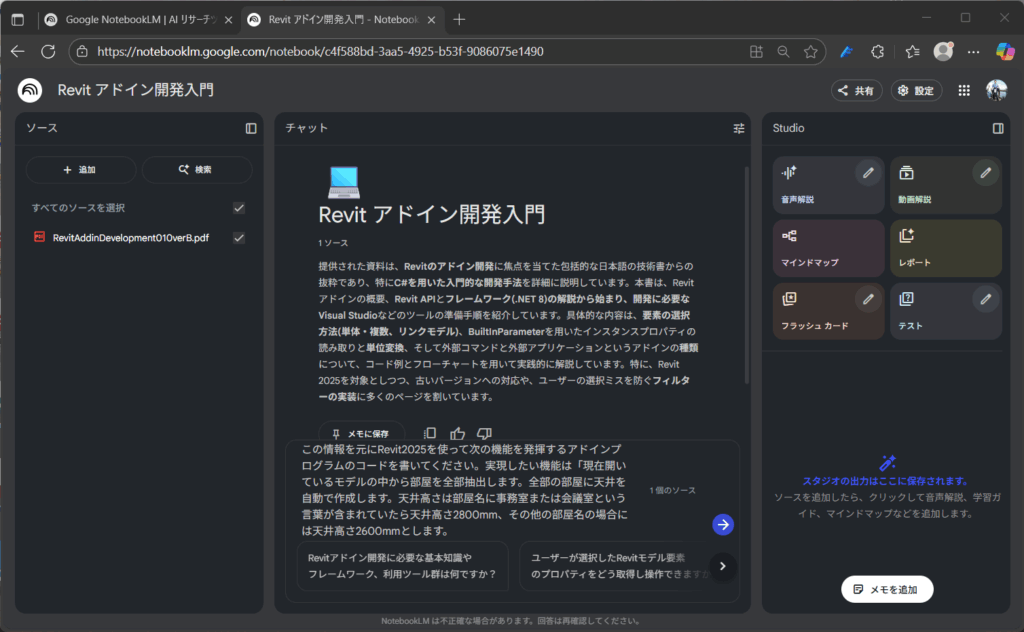 NotebookLMは資料をアップロードするとそれをもとにAIが結果を出してくれるものです。もちろん世の中にある情報はプレトレーニングしたAIなのでかなり知識はもっており、それに自分の専門知識をさらに教える的な構造です。つまり、ChatGTPなどのように世の中の幅広い情報からだけ汎用的な結果を出すのではなく、自分の教えたことがベースになり、さらに専門的、特化的なことをさせることができます。上記の画面で提供する情報をPDFなどでアップロードします。私の場合には自分で執筆したRevitアドインの書籍をPDFに変換してアップロードします。ここにアドインの作り方やサンプルコード、解説が書いてあります。これ勉強しておいてという感じです。