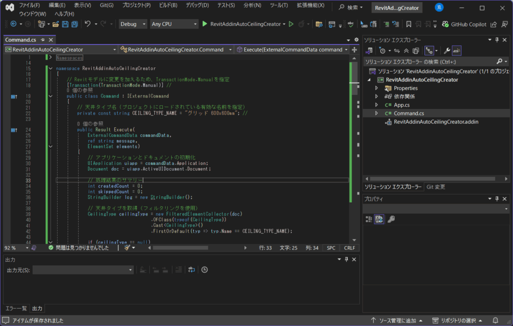 Visual Studioを立ち上げてアドインのプロジェクトを作り、NotebookLMが作ってくれたコードを貼り付けます。とりあえず明らかなエラーはありません。(今のところ)