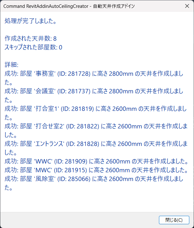 「この情報を元にRevit2025を使って次の機能を発揮するアドインプログラムのコードを書いてください。実現したい機能は「現在開いているモデルの中から部屋を全部抽出します。全部の部屋に天井を自動で作成します。天井高さは部屋名に事務室または会議室という言葉が含まれていたら天井高さ2800mm、その他の部屋名の場合には天井高さ2600mmとします。」