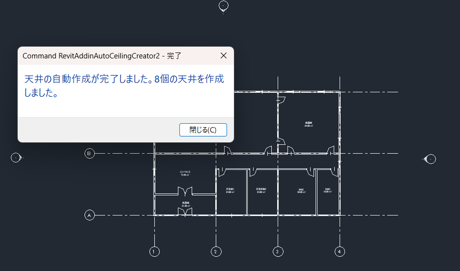 }コードを修正して動くようにして再実行すると次のようになりました。完了メッセージも何故か変わっています。結果として天井は作成されましたが。