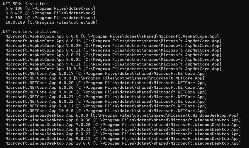 Revit2025はマイクロソフトの.NET8上で構築されているためパソコンに.NET8がインストールされていない可能性がある。どの.NETが入っているか確認するためにコマンドプロンプトでdotnet –infoというコマンドを実行する。次のようにインストールされているものが表示される。ここに.NET8が無いとダメ!この例は有る状態。