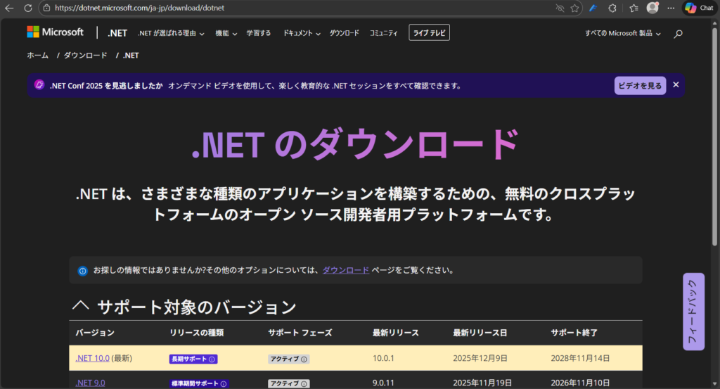 もし.NET8が無い場合にはhttps://dotnet.microsoft.com/ja-jp/download/dotnet(下図)からダウンロードしてインストールする。企業ではアドミン権限のある人に依頼しないとダメ。