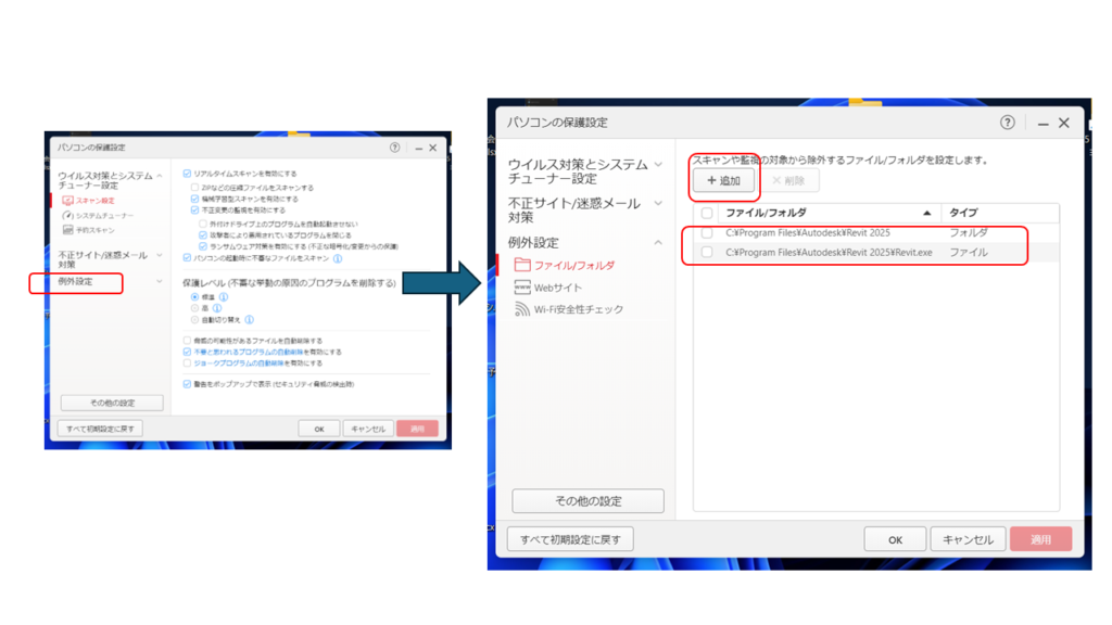ウィルスバスターがじゃまをしている(いや、失礼、きちんと守っている)のでRevit2025が起動できない。ウィルスバスターの「例外設定」で「追加」ボタンを押し、Revit関連の2つのフォルダーを除外するフォルダーとして追加する。Revit2025は怪しいものではございません。